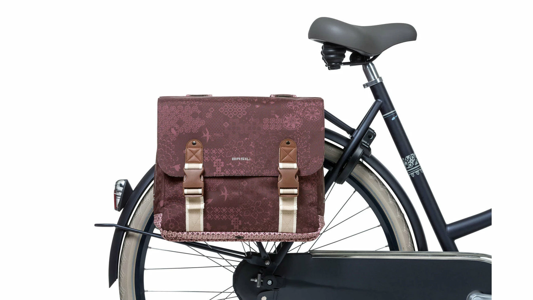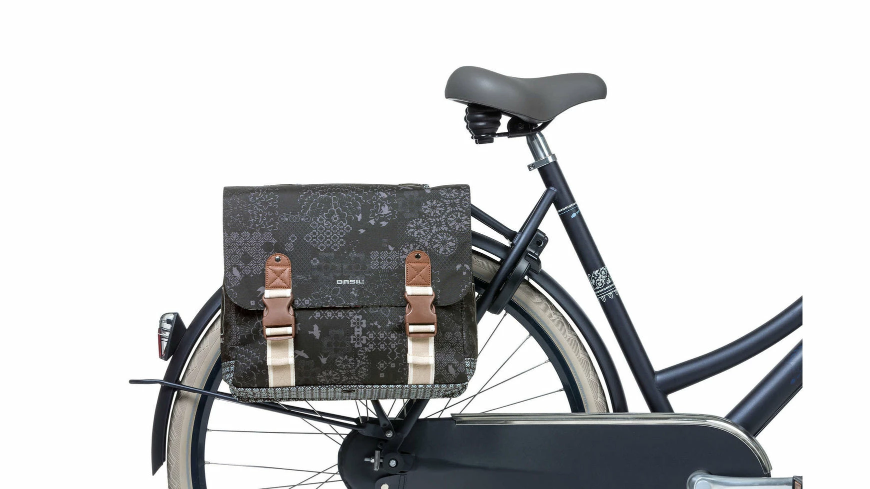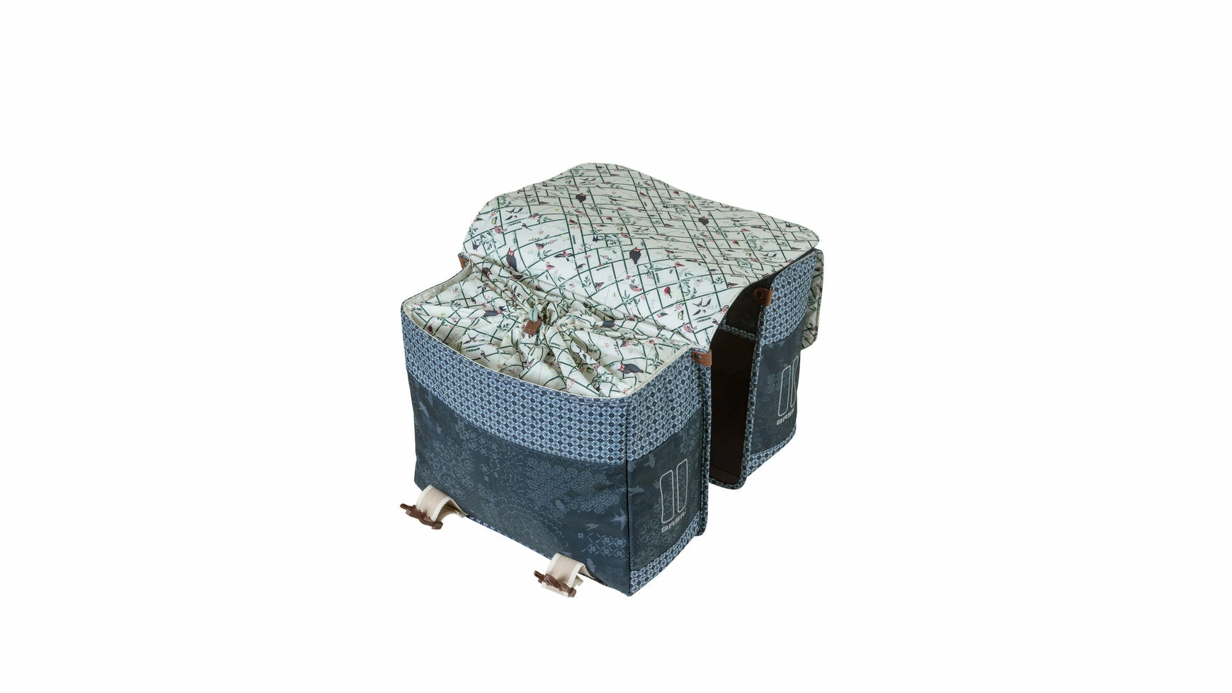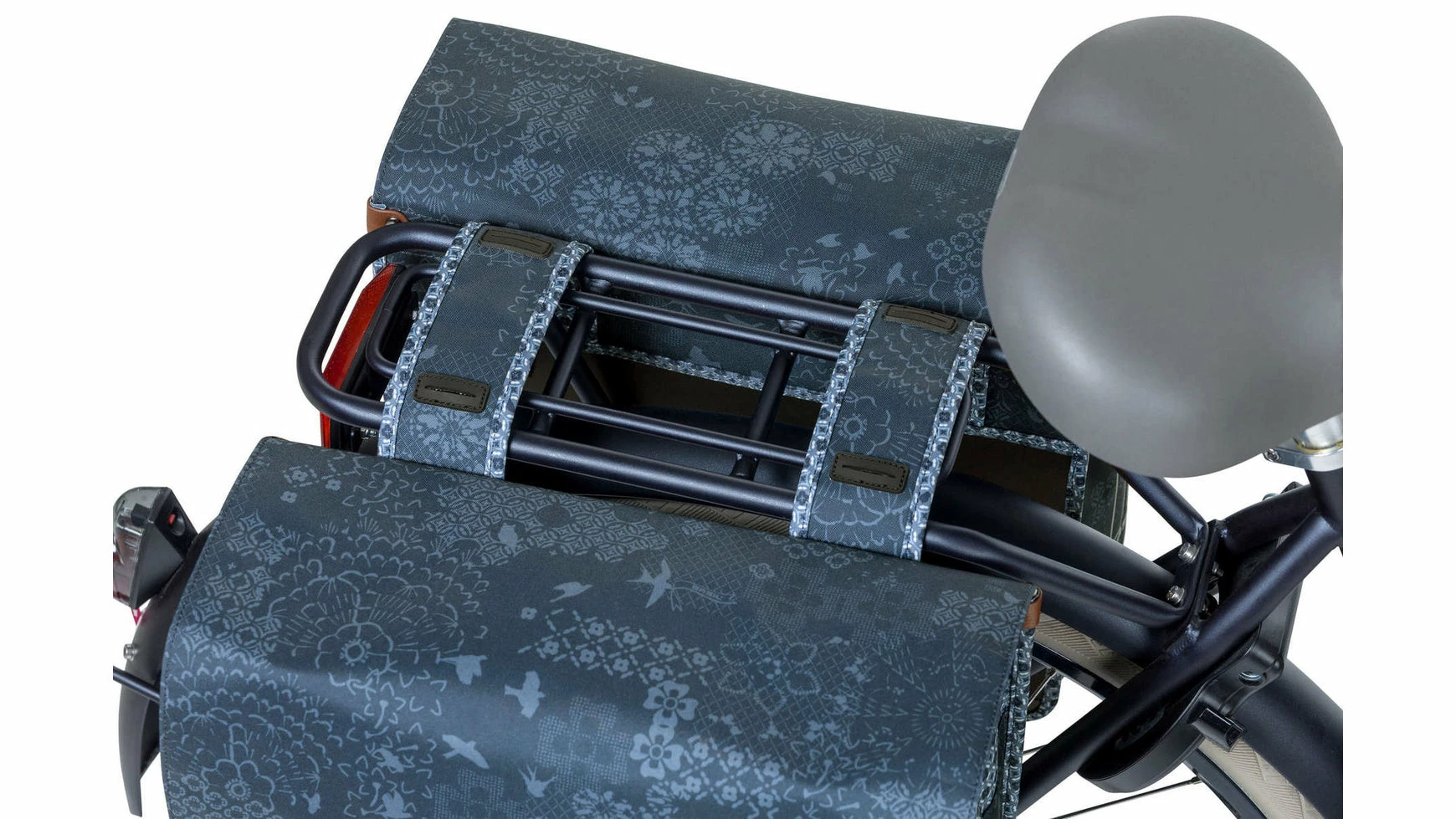 Der Basil Boheme Doppeltasche ist eine doppelte Fahrradtasche mit einem stilvollen böhmischen Print. Die blaue Tasche hat einen Inhalt von 35 Litern, womit man mehr als genug Einkaufsgegenstände, Sportsachen oder andere Bedarfsgegenständedarin unterbekommt. Eine Fahrradfahrt zum Supermarkt oder ein Trip mit Freundinnen, diese Fahrradtasche macht deine Fahrradfahrt einfacher und schöner. Die Fahrradtasche ist geeignet für diverse Gepäckträger (auch E-Bikes) und verfügt über eine stabile Innenfütterung und Details aus Kunstleder. Mit Hilfe des Kordelzugs und der verstellbaren Steckschnallen ist die Tasche gut zu schließen. Durch das wasserabweisende Polyester bleibt der Inhalt der Tasche trocken bei einem kleinen Regenschauer. Die Reflektordetails an beiden Seiten sorgen dafür, dass man in Dunkelheit besser sichtbar ist. Mit dem Universal Bridge System kannst du die die Tasche einfach auf deinem Gepäckträger montieren.Sie passt auch auf den Gepäckträger deines E-Bikes.