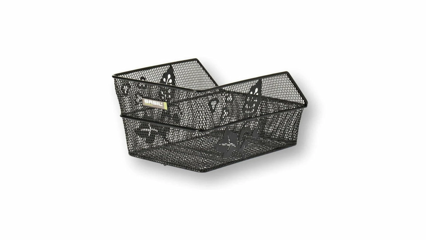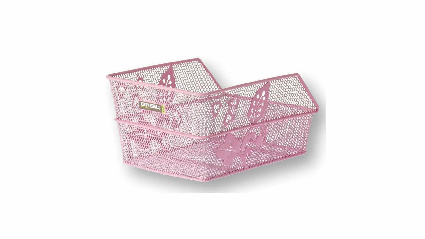 HR-Schultaschenkorb, klein, Stahl, engmaschig, feste Montage auf Gepäckträger (inkl. Befestigungsmaterial), Blumenmotiv,abgeschrägt, stabiler Rahmen, Korb wird in Fahrtrichtung befestigt, Oberm: 34x26c.