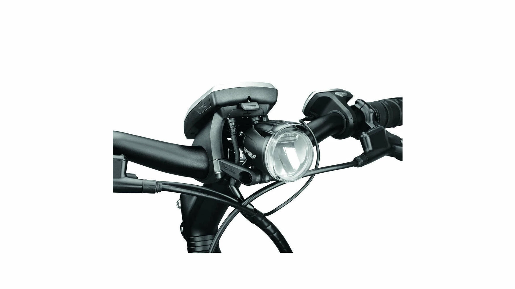 Mit einem zweiarmigen Halter können Dynamo-Scheinwerfer platzsparend an der Lenkermitte befestigt werden. Auch für E-Bikes ideal: Die oberen Schellen des Halters können durch die Halterung von Bosch-Bordcomputer ersetzt werden, so dass Steuerung und Licht zusammengebracht werden.