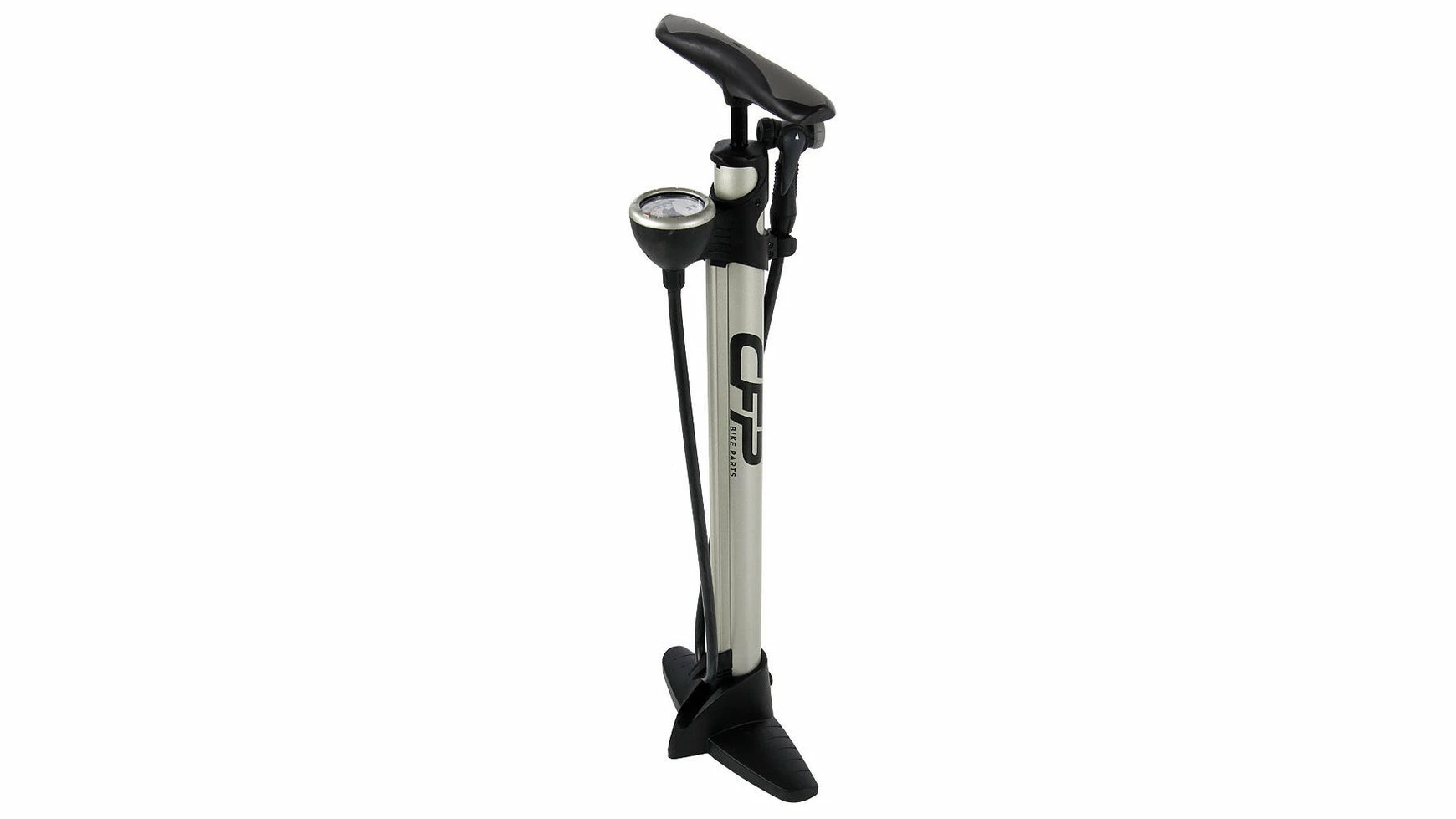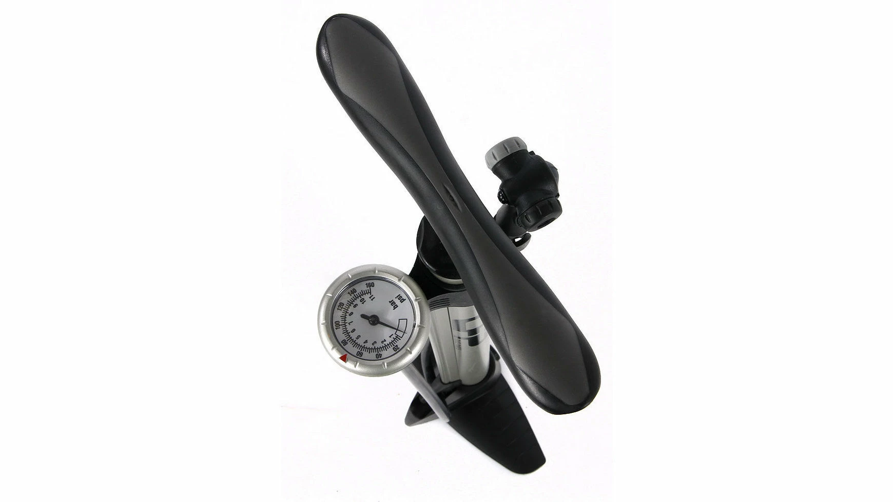 Standpumpe mit hochwertigem Pumpenzylinder aus Stahl. Der Druck von maximal 8 bar / 120 psi lässt sich leicht auf dem großen Manometer ablesen. Ein stabiler Standfuß mit breiter Trittfläche sorgt für sicheres Pumpen. Durch den markierten Klemmhebel lässt sich praktisch zwischen den Ventilarten wechseln. Der ergonomische T-Griff mit Gummi-Einlage dient zum einfachen und sicheren Pumpen.