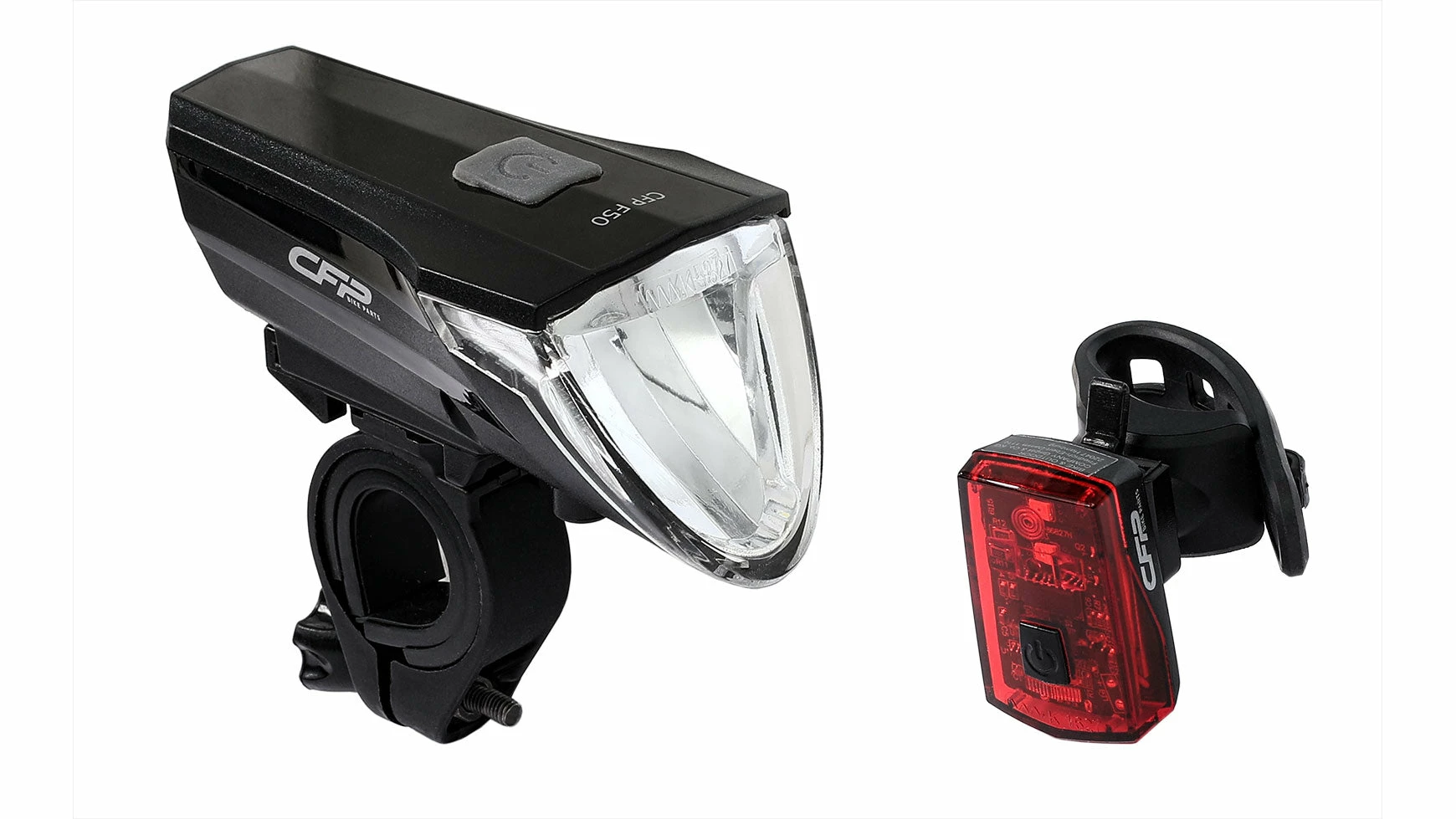 Frontlicht: 1 Hoch-Leistungs-LED 3 umschaltbare Lichtmodi: 50/30/15 Lux Integrierter Akku mit 1700 mAh Leuchtdauer: 50/4, 30/6,5, 15/13 (Lux/Stunden) Elastischer Gummihalter, werkzeugfreie Montage Nach IP65 schmutz- und wasserfest Rücklicht: 1 Hoch-Leistungs-LED Integrierter Akku mit 480 mAh Leuchtdauer: ca. 5 Stunden