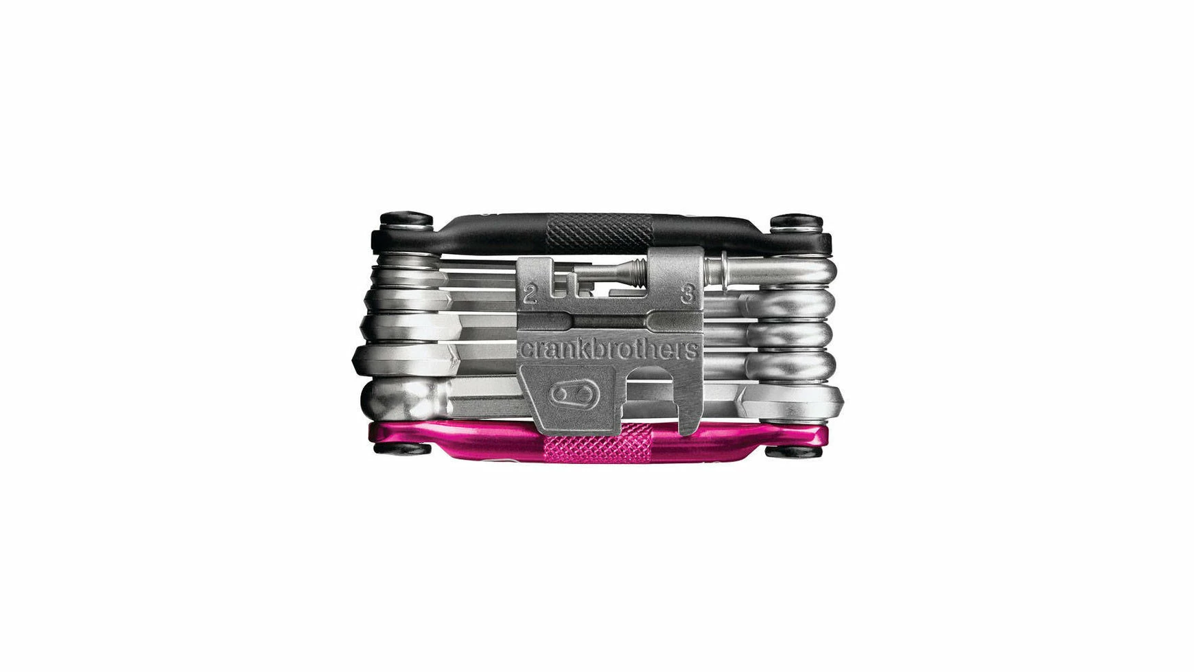Crankbrothers M-17 Multitool mit 17 Funktionen: 2, 2.5, 3, 4, 5, 6 und 8mm Innensechskantschlüssel. Kreuz- und Schlitzschraubendreher, 25er Torx, Kettennieter, Speichenschlüssel in 4 Größen, 8 und 10mm Maulschlüssel.