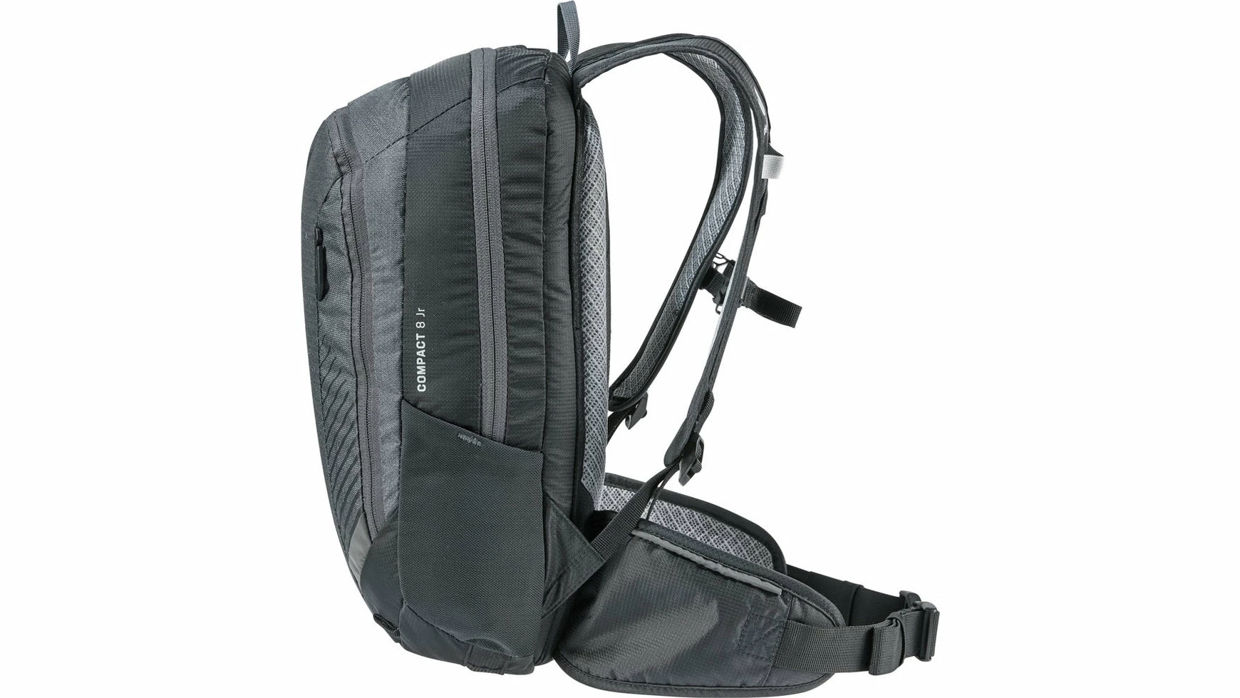 Ein Mountainbike-Rucksack für junge Nachwuchstalente: der Compact 8 Jr. Dank ergonomischer Schulterträger, verstellbarem Brustgurt und Hüftflossen sitzt er sicher und bequem auf dem Rücken und bleibt auch in schnellen Kurven fest am Körper. Zudem besticht der Bike-Rucksack mit seiner durchdachten Ausstattung: eine verstaubare Protektoren-Halterung unten am Rucksack, eine praktische Helmhalterung mit Befestigungs-Clips, ein geräumiges Hauptfach für Ersatzbekleidung und Proviant, ein schnell zugängliches Werkzeugfach und zwei elastische Seitenfächer.