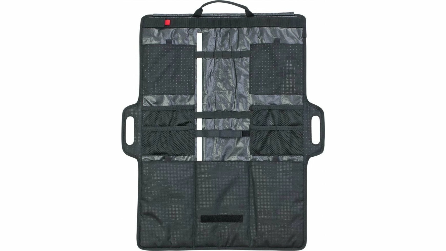 Tasche zum Aufrollen, mit vielen Unterteilungen für sicheren und gut organisierten Transport von viel Werkzeug und extra langen E-Bike-Akkus sowie Zubehör.