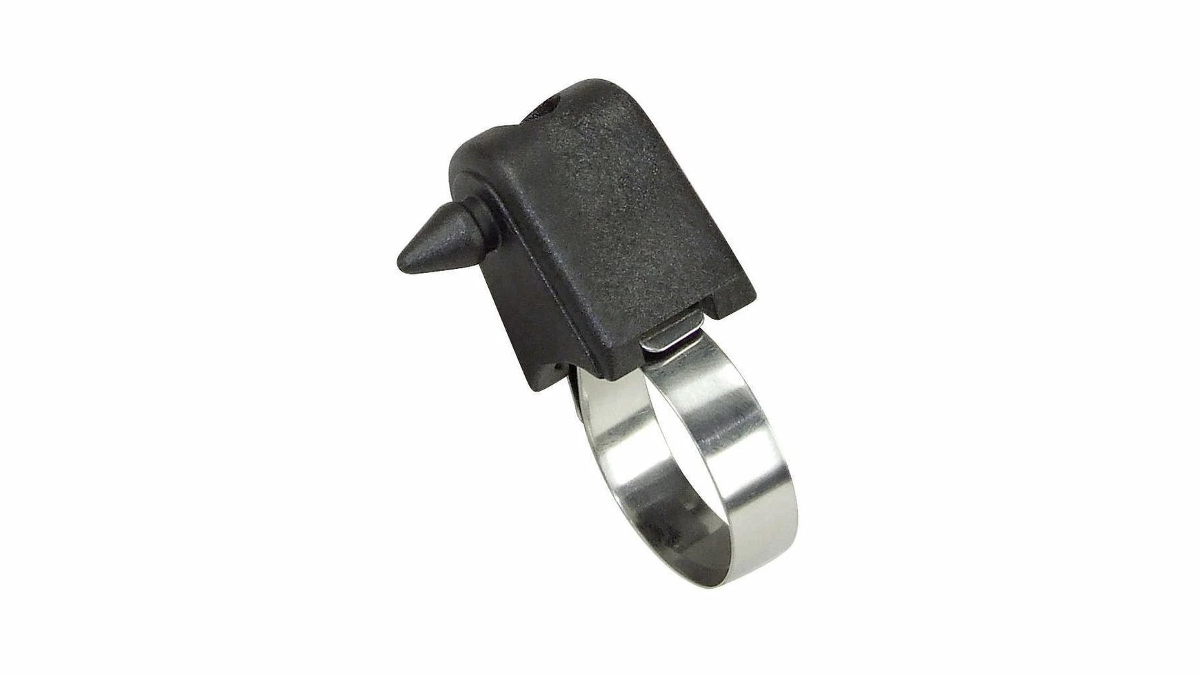 Nachrüstbarer Halter für Luftpumpen. Mit Edelstahlschelle auf allen Rohrdurchmessern von Ø 15 – 45 mm zu montieren.